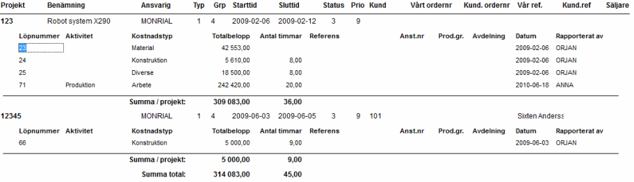För rapporterade kostnader till aktiviteter i projekt visas; löpnummer (för varje rapportering), aktivitet, kostnadstyp, totalbelopp, antal timmar, referens, anställningsnummer, produktionsgrupp, avdelning, datum och vem som rapporterat kostnaden.