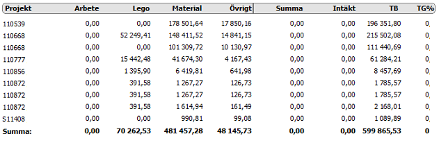 Obs! När det gäller utläsning av materialkostnader, så får artiklar utan saldohantering (Hinkartiklar) inte någon materialkostnad när beräkningssätt Beräkna från loggposter är valt. Detta beror på att artiklar som inte saldohanteras inte finns med i lagerloggen. Eftersom materialkostnaden hämtas från lagerloggen så kommer inte kostnader för dessa artiklar med.