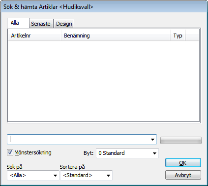 Det är möjligt att göra "mönstersökning" på tecken och fraser i de kolumner som visas i Sök & hämta fönstret. Det går även att mönstersöka på numeriska värden. Markeras Mönstersökning i fliken Alla, förbereds Sök & hämta för mönstersökning.