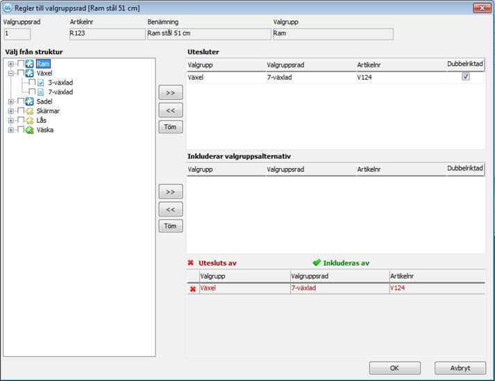 Under Utesluter adderas de valalternativ eller valgrupper som inte ska gå att kombinera med aktuellt valalternativ. I bildexemplet går alltså inte valalternativen "7-växlad" samt "Skärmar fram och bak, plast" att kombinera med valalternativ "Ram stål 51 cm" (som regelfönstret gäller för).