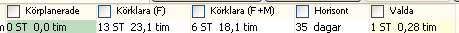 Filtren visar operationer i antal och tid och aktiveras genom att klicka i rubriken till ett av fälten. Det aktiva filter som visar det lägsta antalet jobb är det som är styrande. Körklara (F) innebär operationer som har föregående operation klar. Körklara (F+M) innebär operationer som både har föregående operation klar och som har material klarerat.