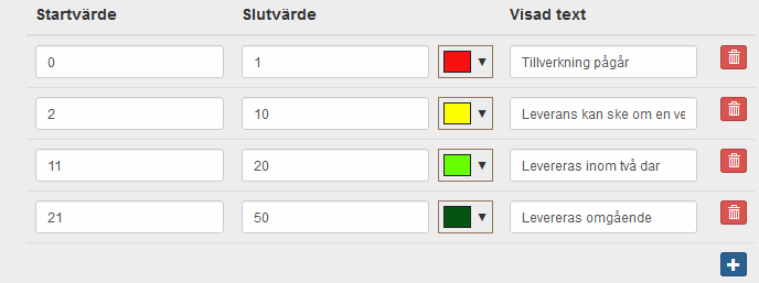Här kan du skapa olika intervall som används om du valt att visa saldo som en ikon. Du skapar en lista med intervall som tillhör ett saldointervall dit artiklar sedan kopplas. Varje intervall har en egen färg samt en text som visas när du för muspekaren över ikonen. Du kan översätta texten till olika språk genom att välja språk i rullgardinsmenyn.