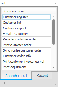 In the field Find procedure (Alt + D) on the title bar in MONITOR G5 there is a find-as-you-type function you can use to find and open procedures. This is an alternative to looking for and open procedures in the module menu. A pattern search is made of the text you type. If you for example start typing "ust" you will get hits for the procedures containing "ust" in their names, such as Customer register and Price adjustment, etc.