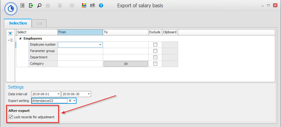 Firstly, when exporting salary data in the Export a salary basis procedure. If you have the Export of salary basis option, the Lock records for adjustment box will be checked by default when exporting a salary basis.