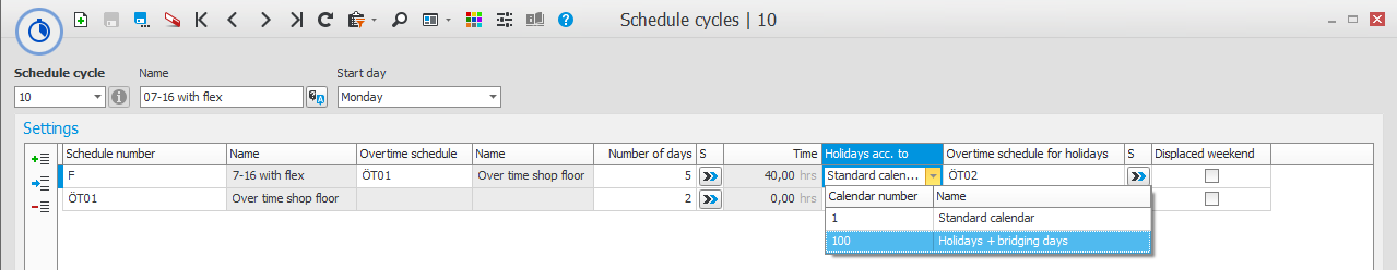 In the Schedule cycles procedure, under the Holidays acc. to column, you can select the calendar number with your bridging days.