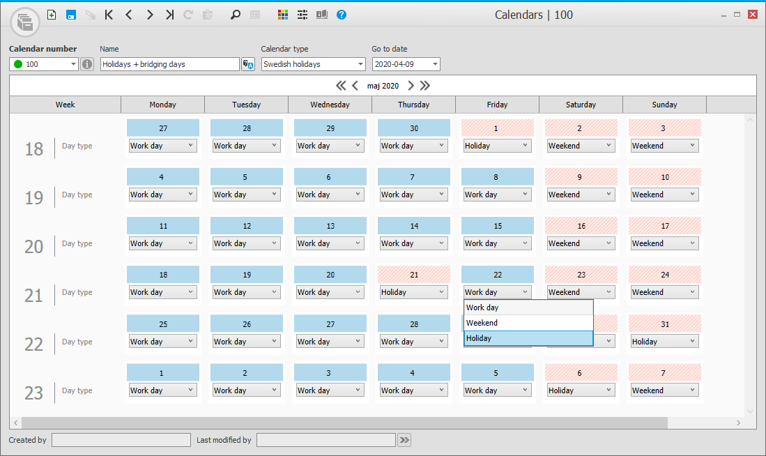 You can register bridging days by selecting Holiday for the days in question in the Calendars procedure under General registers.