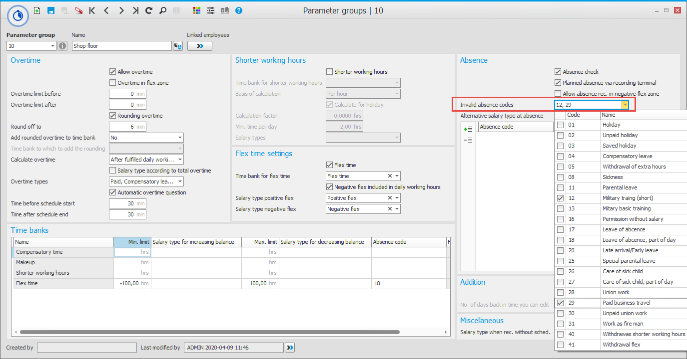 New time banks can be added under the Time banks tab in the Basic data – Attendance procedure. In order for the parameter group to be able to use the time bank, an absence code must be linked to the time bank in the Parameter groups procedure.
