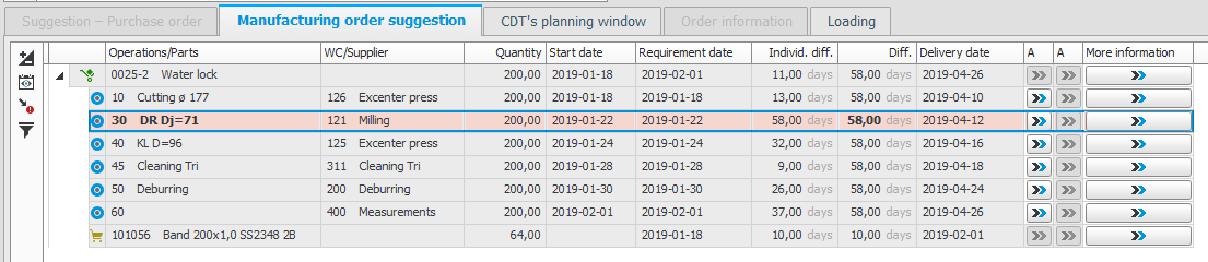 In the result window there is a tab under which you can see a planing window. Depending on how the order is supplied, you can under additional tabs also see purchase order suggestion, manufacturing order suggestion, order information, or the loading as a chart.
