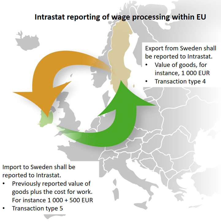 Export of goods for subcontract work (wage processing) must be reported to Intrastat (with a separate transaction type). For export, the value of the goods at the time of export is reported. Re-imports following subcontract work are reported as imports in Intrastat (with a separate transaction type). The value of the goods at the point of import and the value of the subcontract work performed are entered here. If the goods are not to be re-imported after subcontract work, only the export is reported (as a normal transaction). The figure below illustrates import and export of subcontract work (wage processing).