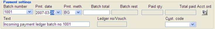The cursor is first located in the Payment date field, then you enter the Payment method, Account, Batch total and Text. By entering the Customer code, the PopUp feature in the Invoice number field under Mark to pay will only search for unpaid invoices from the customer in question.