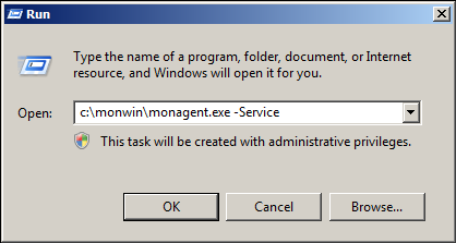 Before the Agent server can be taken into use it has to be registered as a service. This must also be made after an update. In order to do this, run the program monagent.exe with the -Service switch in the command under Start - Run... (or the Windows button + R). For example if MONITOR is installed in C:\monwin, you enter c:\monwin\monagent.exe -Service in the command prompt.