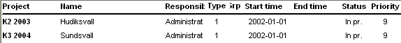 You will also find the following information about the project in this list; Project code, Name, Responsible, Type, Group, Start time, End time, Status, Priority, Customer code, Our order number, Customer's order number, Our reference, Customer's reference and Seller.