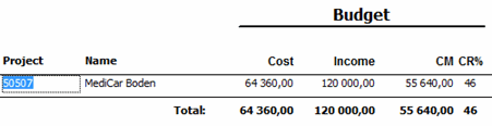 By right-clicking in the list, the option Detailed project summary / Project can be selected in the Info menu to see more information about a project. You are then linked to the list type Extended cost/income where detailed information about the current project's costs and income is shown based on the same calculation method Load saved values.