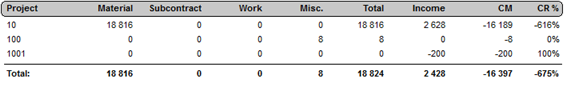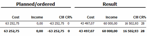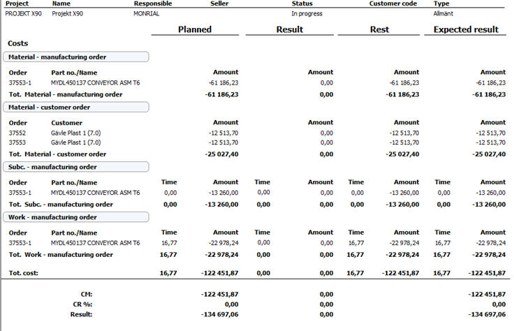 In the Extended cost/income list with the calculation method Load saved values you will see information about costs and income of a project in detail. The report is classified by cost type and displays the orders, vouchers and directly registered costs that constitute the base of the project's planned and actual costs and income. The rows in the report that concern orders also display rest values on orders and expected result when the project is finished. In records that apply to manufacturing orders, you will see the part number and part name. In records that apply to customer orders and purchase orders, you will also see the name of the customer and supplier.