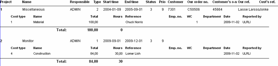 For each reported cost and activity of a project the following information is shown: Consecutive number, Activity, Cost type, Total, Hours, Reference, Employee number, Work center, Department, Date of reporting and by whom the reporting was made.