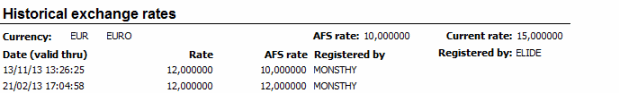 In the Current exchange rates list you will find the current rate and AFS rate for each currency, when the currency was updated with the new currency and by whom.