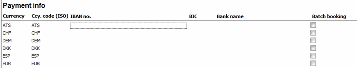 In the International Payment list you will see the currency and currency code ISO. You can update the bank account number, BIC, bank name, and batch booking.