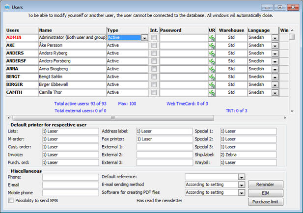 Open the Users procedure under the Printers / Users menu in the Global Settings module. Here you find all registered MONITOR users. Select a user in the list and then click the EIM button as you can see in the image below.