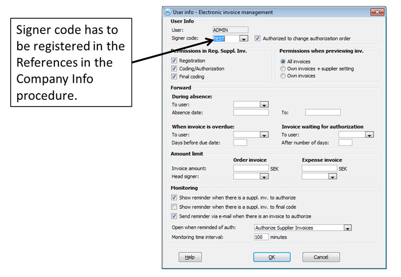 The first thing you have to do in order to get started with the Electronic Invoice Management is to register information for the users in MONITOR that will use the function. This also includes the users who will only be able to view the supplier invoices on screen.