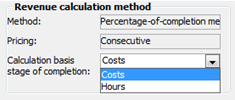 Under the General tab you will find the heading Revenue calculation method. Here you will see information about the selected method as well as pricing for the project type. In the Calculation basis stage of completion field you select if the calculation should be based on costs or hours. Costs are selected by default.