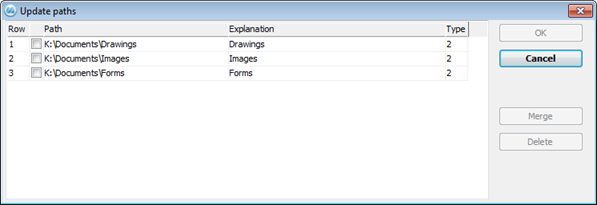 Merging paths is only intended for paths pointing to the same folder! For example when one path contains a UNC path and the other path contains a driver letter, or if the paths have different driver letters. Several paths pointing to the same folder arise if the users, who link the document and at the same time create paths, not only use the UNC path or if they have different drive letters for the path in the Explorer on their computers.