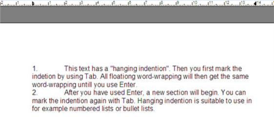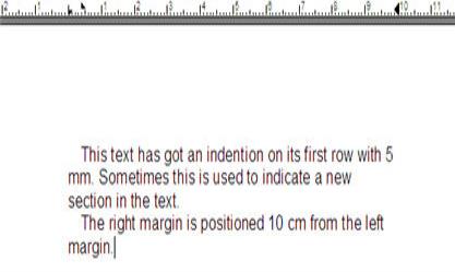 On the ruler there are certain symbols indicating the margins and the tabs that you have entered. The left edge indicates two arrows for the left margin, and the first line indentation. The right edge indicates one arrow for the right margin. By clicking on the tab bar, you can enter your own tab stops where the cursor is placed. You select the tab types using the shortcut buttons on the button row.