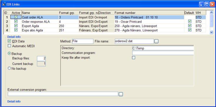 EDI Links window consists of a table where links for EDI import and export files are configured. Each link has its own separate row in the table, and can be identified in the system with a row number (ID).