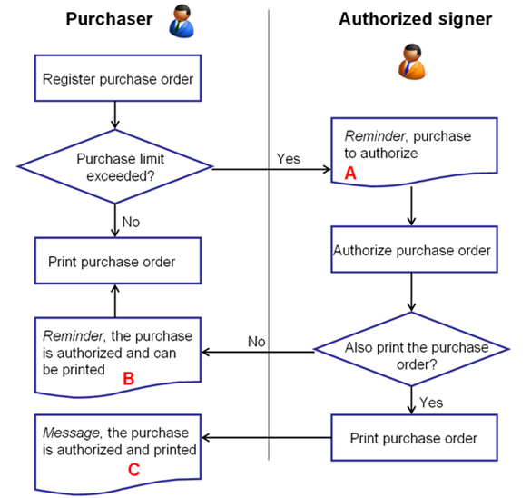 - Show reminder that order is to be approved - this monitoring function targets the authorized signer (event A in the illustration below). When the reminder is displayed it is possible to link directly to the Orders Needing Approval procedure to authorize the purchase order.