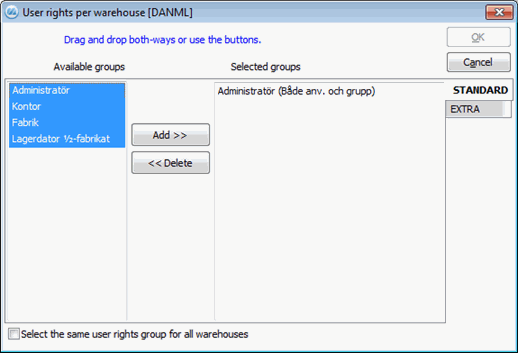 If Warehouse Management (supplement) is used you create warehouses in the Company Info procedure. When this is done you also have the opportunity to here select warehouse, so that you can add a user rights group for one user per warehouse. You can then at the bottom of the window select that the same group should apply for all warehouses.