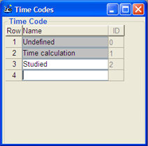 The Time Codes procedure contains a table, in which you can enter an optional number of rows for your own time codes. Each row gets an ID that identifies the time code in question. After that you enter a time code name. The first two rows are pre-defined time codes that come with the system. The first one Undefined is the system default, and is used when time codes are not applied. These two time codes cannot be changed.