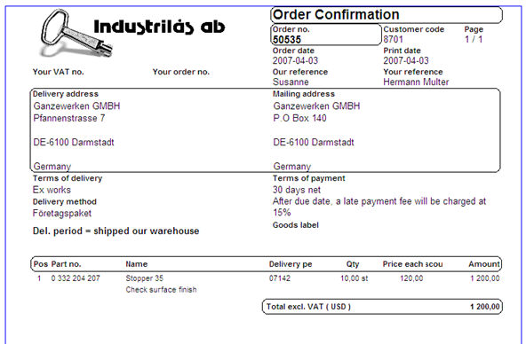 Sample of a printout of the Order confirmation form.