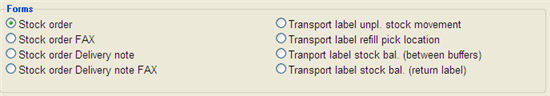 This form type contains forms for stock orders. These stock order forms are used if the MONITOR supplement Warehouse Management is installed. Here you also have forms for transport labels for different Reporting events/stock transactions.