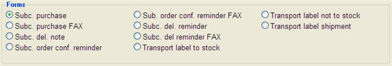 Contains forms for Subcontract purchase, Subcontract purchase e-mail, Subcontract delivery note, Subcontract order confirmation reminder, Subcontract order confirmation reminder e-mail, Subcontract delivery reminder, Subcontract delivery reminder e-mail, Transport label to stock (arrival of manufacturing order), Transport label not to stock (manufacturing order in progress between operations), Transport label shipment (to subcontractor) and Delivery schedules - subcontract.