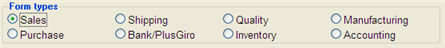 Under Form Types you will see the different form types available in the system. The forms have been divided into the different types Sales, Purchases, Shipping, Bank/PlusGiro, Quality, Inventory, Manufacturing and Accounting. This is where you select a form type to see which forms that are available for that type of form.