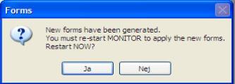 After the forms have been generated, a control question appears saying that MONITOR will have to be restarted in order for the new forms to apply. If you confirm with a Yes, MONITOR will be restarted.
