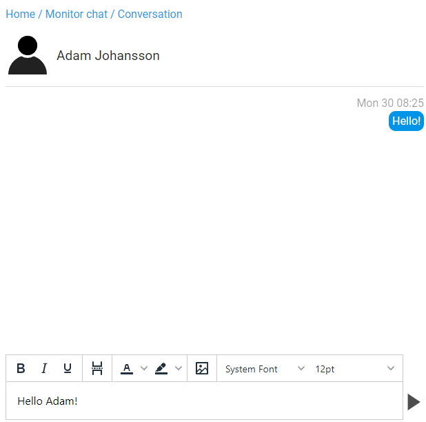 When you start a new conversation or when you open an existing chat, there is a text editor where you can type your message. In the editor you can format your text and add line breaks, etc. You can also enter hyperlinks and upload, send and receive images. You send your messages by tapping the arrow button to the right in the editor.