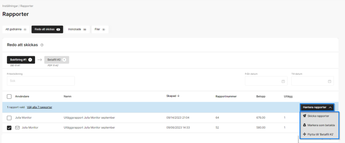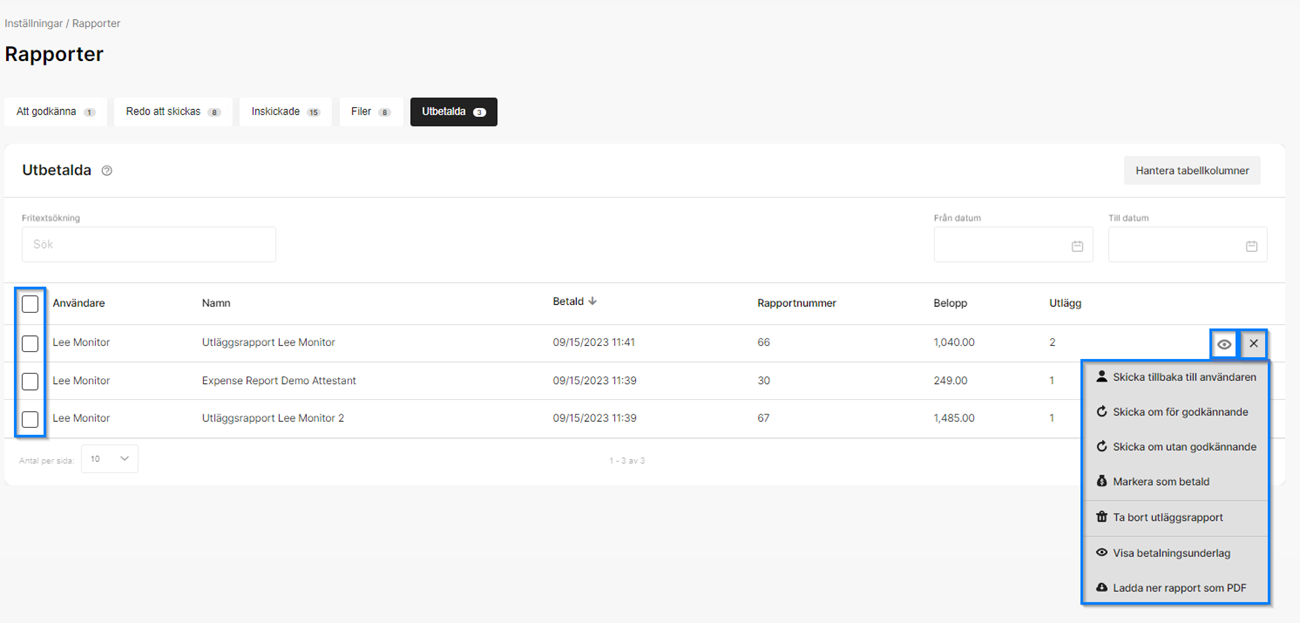 Under fliken Utbetalda kan du nu se att rapporterna är flyttade hit och om du trycker på "de tre prickarna" vid rapporten får du några alternativ att hantera rapporten vid behov. Om du trycker på Visa betalningsunderlag genererar du ett betalningsunderlag för den specifika rapporten. Du kan också välja att markera flera rapporter och sedan klicka på Hantera rapporter (i den blå menyn som visas högst upp i listan) och sedan välja Visa betalningsunderlag för att generera ett betalningsunderlag för alla valda rapporter.