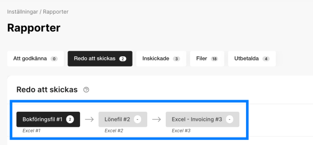Redo att skickas (visas endast om Använd redigeringsläget är aktiverat i integrationsinställningarna på mottagaren) – Det är här du kan granska rapporterna efter att de ha blivit godkända eller när användaren har skickat rapporten (om du inte har aktiverat Godkännande), innan du skickar rapporterna till dina integrerade rapportmottagare. För att skicka flera rapporterna från detta steg samtidigt så behöver du markera de rapporter som du vill skicka och när du markerat dessa kommer den blåa menyn högst upp i listan att visas och där klickar du Hantera rapporter och sedan Skicka rapporter (och för vissa integrationer måste du även välja bokningsdatum efter att du klickat på Skicka rapporter).