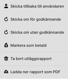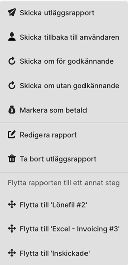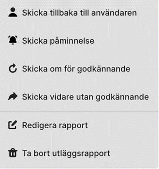 På höger sida, i varje rapportfält, har du "de tre prickarna". Det är här du kan klicka för att se vilka alternativ du har för att hantera rapporten som administratör. Om du till exempel har gjort en ändring i godkännandestrukturen för en rapport som användaren redan har skickat för godkännande måste du Skicka om för godkännande för att den nya godkännandestrukturen ska aktiveras på den specifika rapporten.