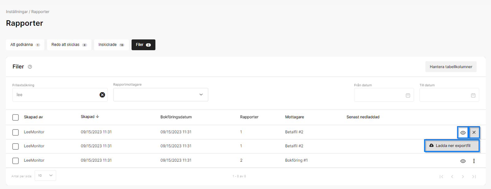 Filer (visas först om eller när du skapar en fil) – Här kan du hitta alla dina skapade filer. Under "de tre prickarna" så kan du ladda ner filerna när du vill, genom att klicka på Ladda ner exportfil. Under "ögat" hittar du en PDF-sammanställning av de rapporter som ingår i filen.