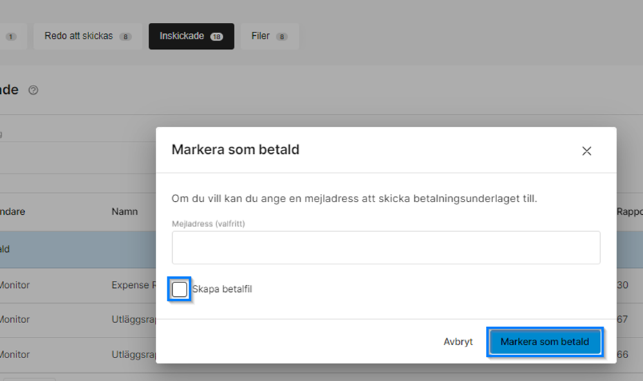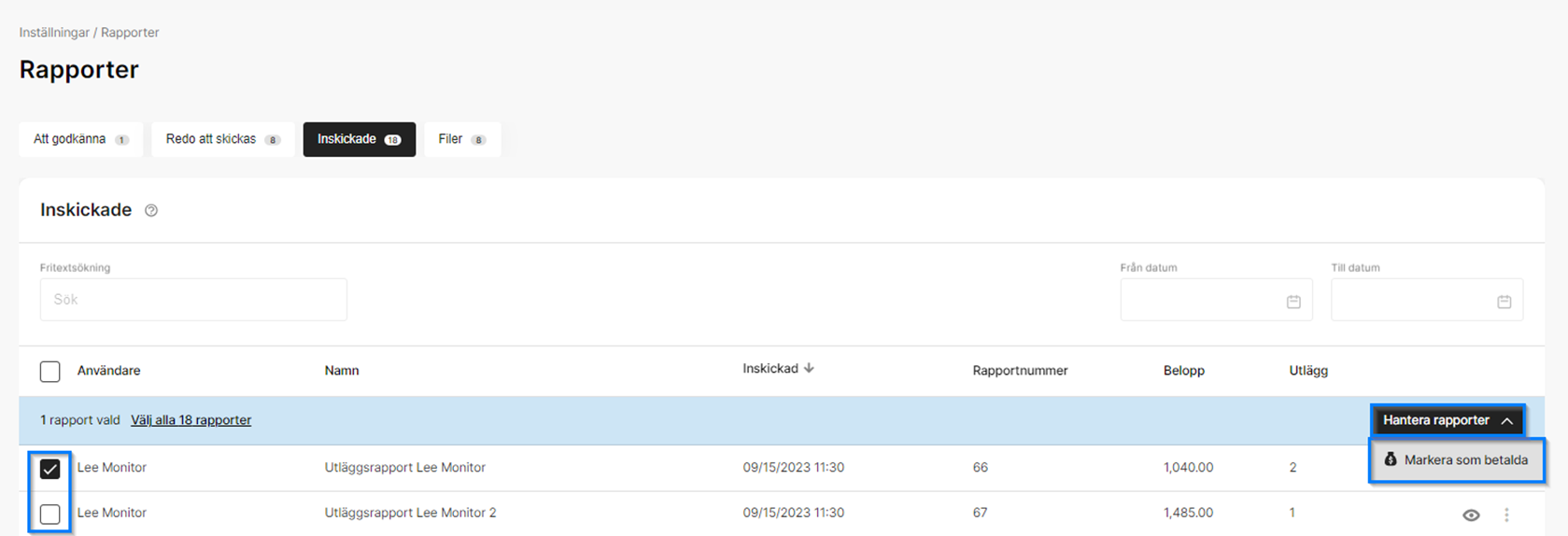 Utbetalda (visas endast om Använd betalningsunderlag är aktiverat i Inställningar > Utläggshantering > Rapportflöde för rapporter) – Om detta är aktiverat har du möjlighet att Markera som betald under fliken Skickat (du behöver markera de rapporter du vill flytta till fliken Utbetalda). När du markerat de rapporter som du vill flytta så klickar du på Hantera rapporter (i den övre blå menyn i listan) och väljer Markera som betalda.