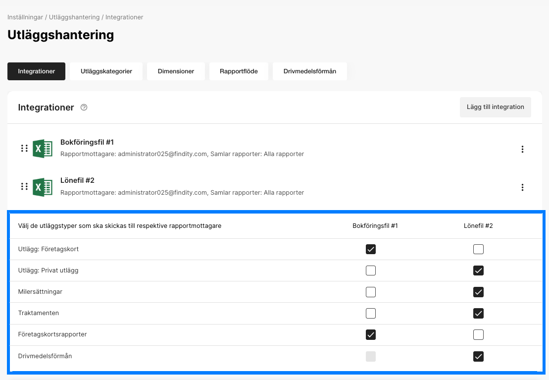 Här väljer du också vilka utläggstyper som ska skickas till vilken rapportmottagare. Under Välj de utläggstyper som ska skickas till respektive rapportmottagare så kryssar du i rutorna för vilken utläggstyp som ska skickas till den specifika rapportmottagaren.