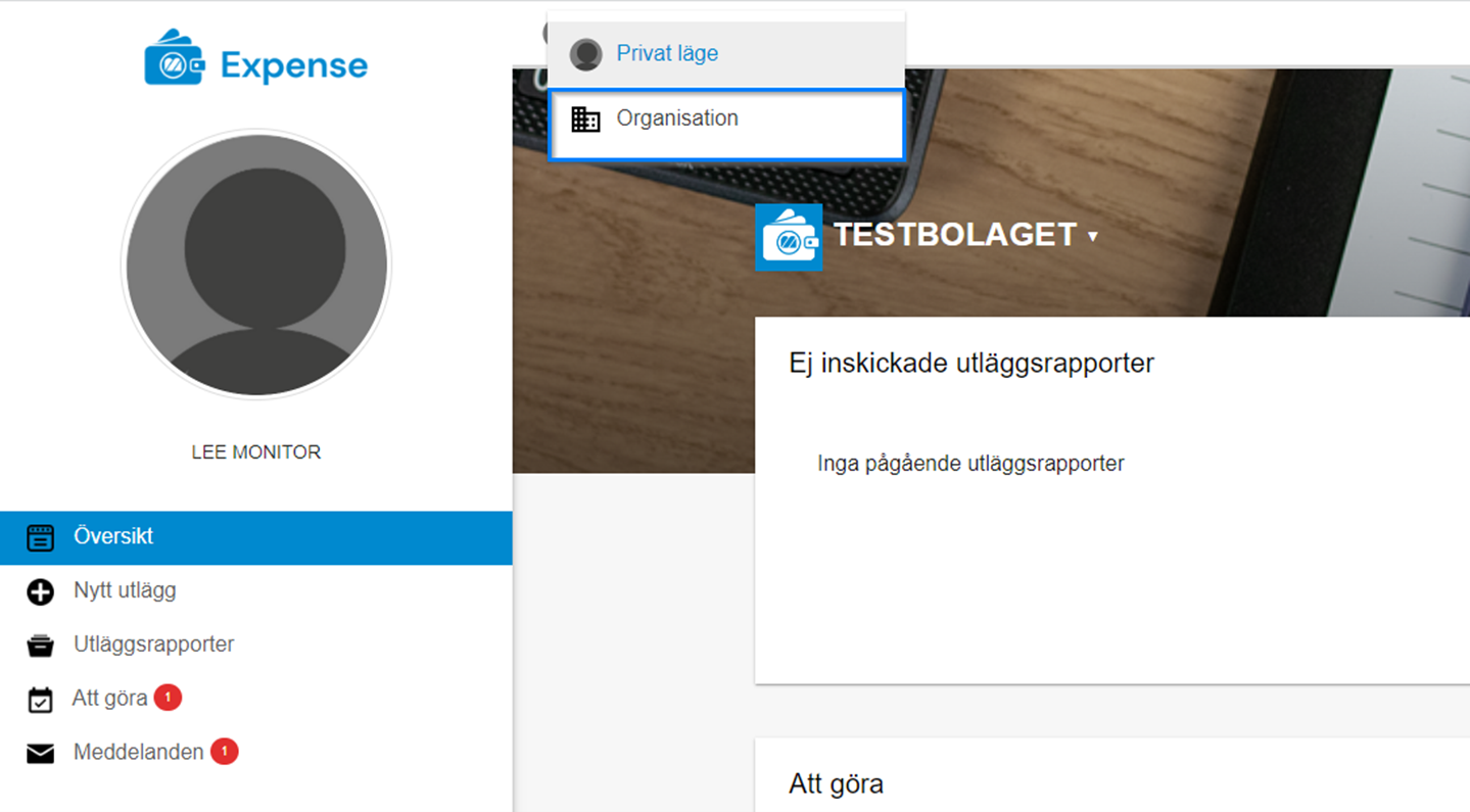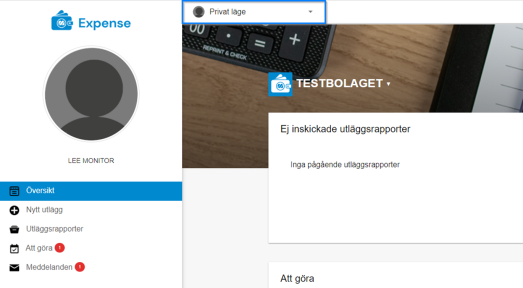 När du loggar in i Monitor Expense kommer du att loggas in i ditt privata läge. För att växla till din organisation och administratörsläget klickar du på rullgardinsmenyn (i det övre vänstra hörnet av ditt fönster) där det står Privat läge.