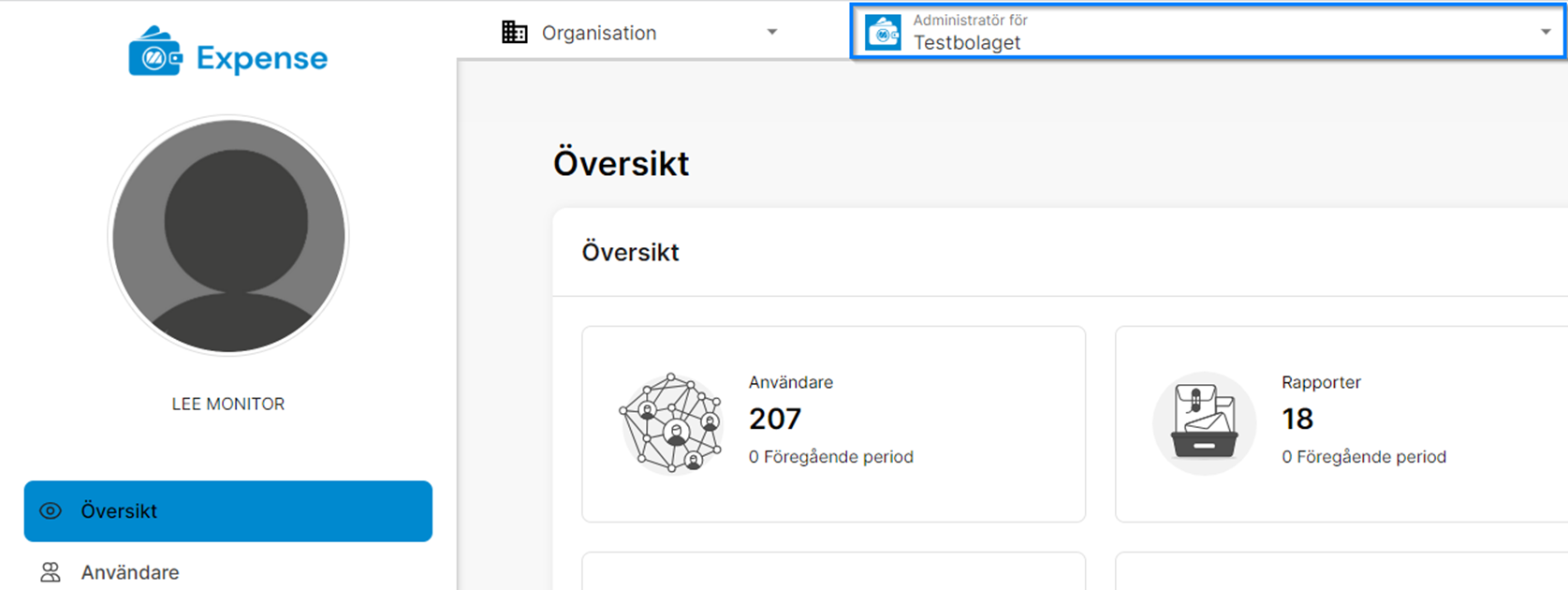 Översikt är den första vyn du kommer till efter att du växlat från Privat läge till Organisation. Här hittar du Avstämningsrapport och Översikt.