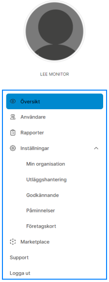 Företagskort (visas endast om företagskort är aktiverat i Marketplace) – Här kan du se användarnas företagskortsrapporter, om företaget har betalningsansvaret. Det är också möjligt att skicka påminnelser till användaren, om kortfakturan har mottagits för faktureringsperioden och det är dags för användaren att skicka in rapporterna (denna funktion är inte tillgänglig om användarna har privat betalningsansvar eller om du använder First Card real tidstransaktioner).