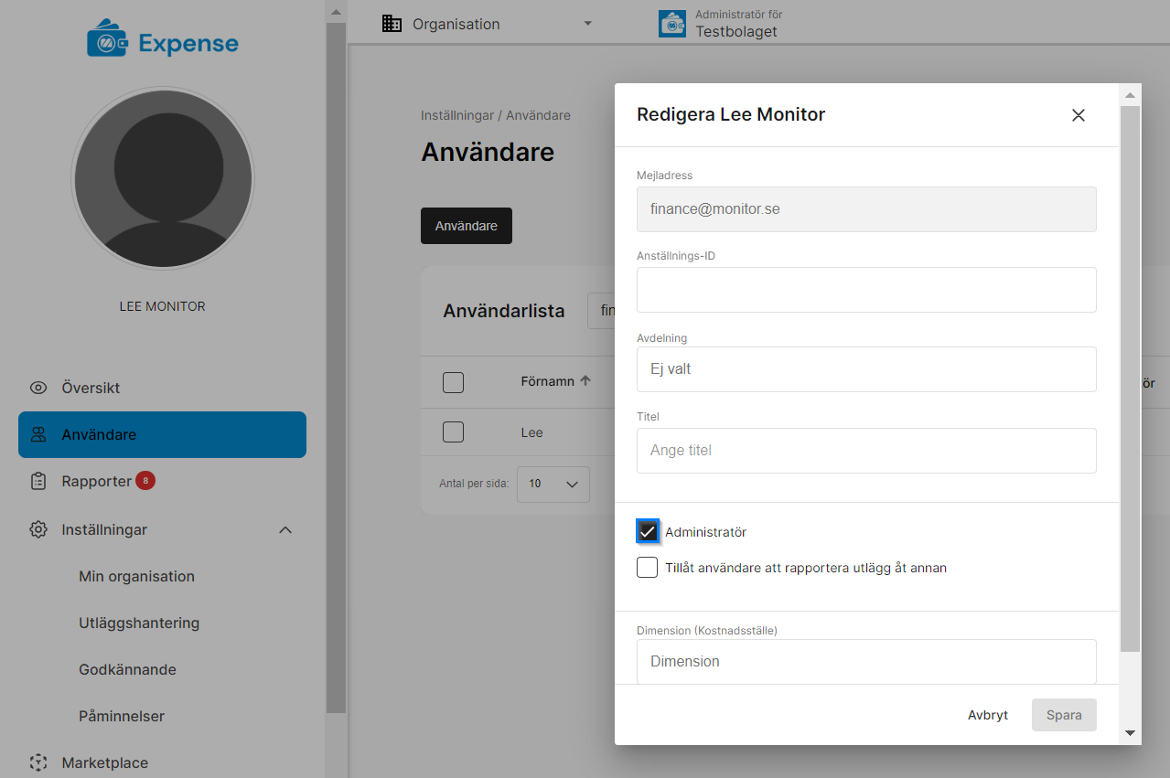 Här kan du även hantera användarnas anställningsnummer, om de kan redovisa utlägg för en annan användare och vilken avdelning de tillhör etc.