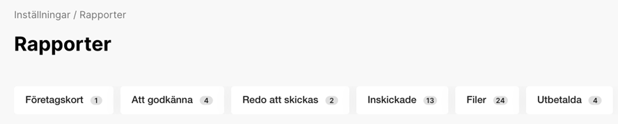 Att godkänna (visas endast om Godkännande är aktiverat under Inställningar > Godkännande) – Under denna flik ser du vilka rapporter som har skickats in av användaren för godkännande. Du kan även se vem eller vilka som har rapporten för godkännande för tillfället under rubriken Godkännande. Om det finns flera godkännare på en rapport kan du klicka på "ögat" för att se hela rapporten och mer information om godkännarna under varje utlägg.