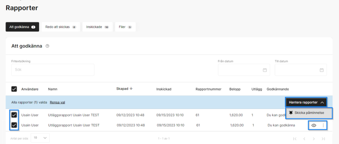 Om du vill skicka en påminnelse till godkännaren/godkännarna om att hantera rapporten så kan du markera rapporten/rapporterna och trycka på Hantera rapporter (som kommer att dyka upp i en blå meny högst upp i listan när du markerar rapporterna), klicka sedan på Skicka påminnelse i listan.