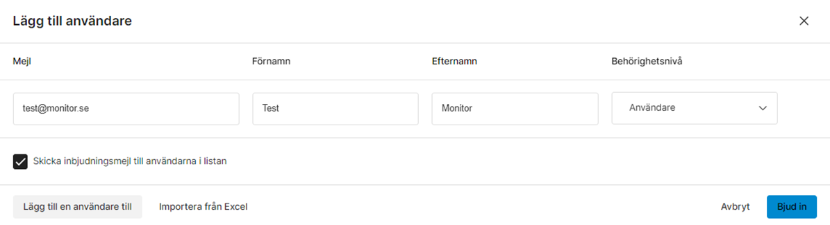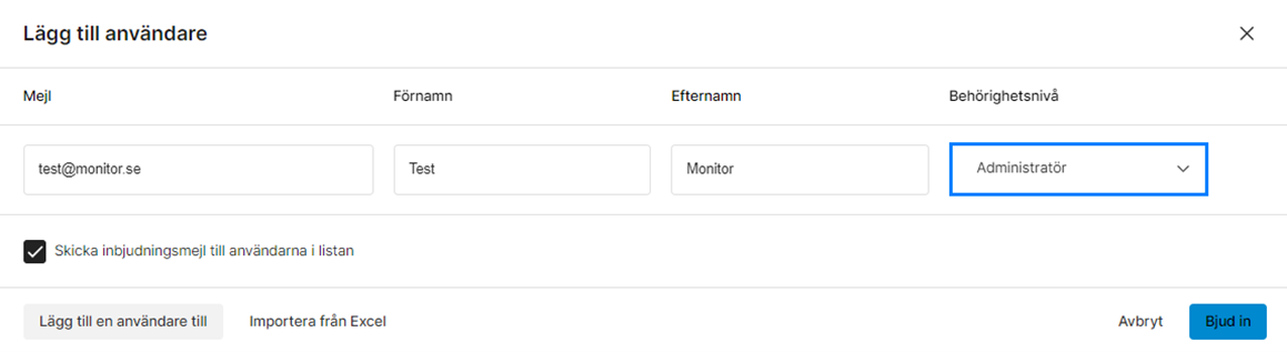 Fyll i e-postadressen, namn och behörighetsnivå och klicka Bjud in när du är klar. Vill du avvakta med att skicka ett inbjudningsmail så bockar du ur rutan Skicka inbjudningsmail till användarna i listan. Då får du istället valet att Spara dina nya inställningar och användarna kommer att läggas in användarlistan i kursiv text.
