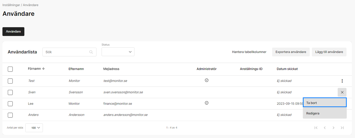 För att Ta bort en användare klickar du på "de tre prickarna" till höger om användaren som du vill ta bort. Att ta bort en användare är en åtgärd som inte går att ångra. Observera att alla ej inskickade utlägg kommer att raderas på användaren.